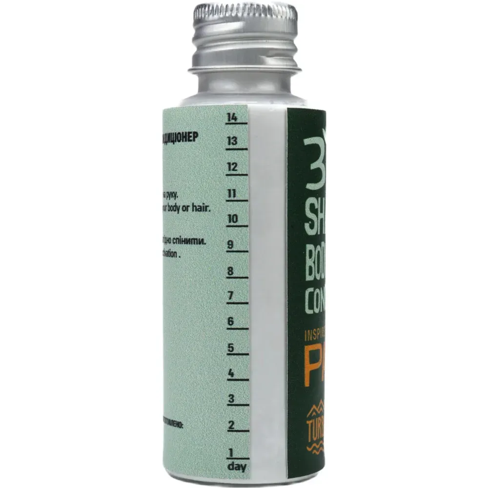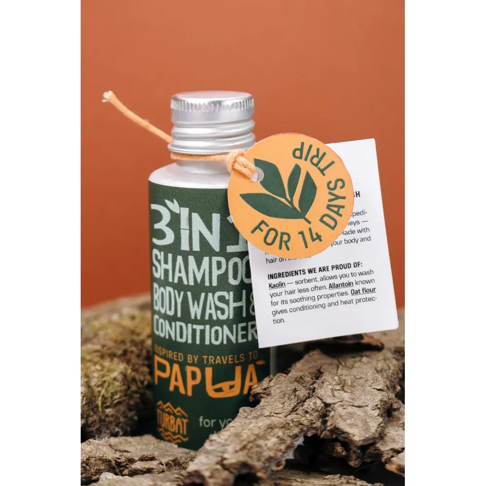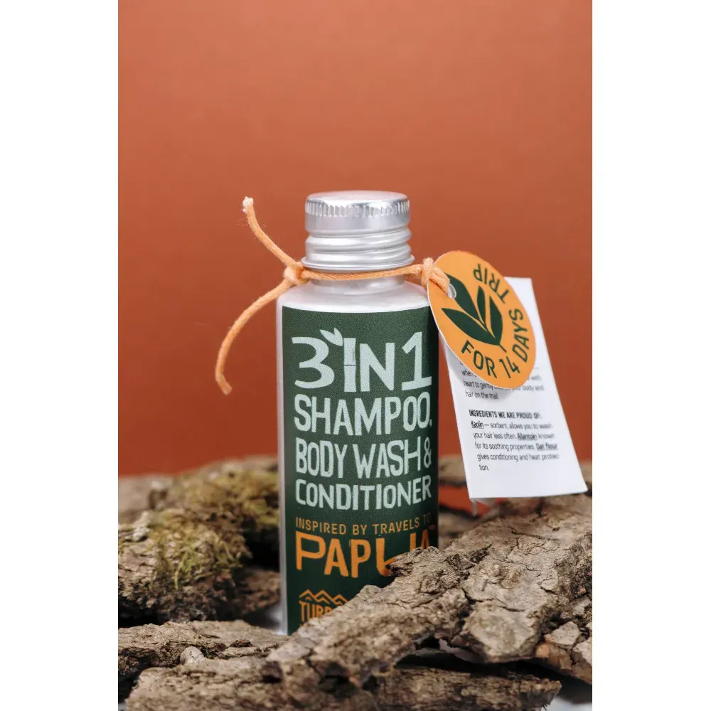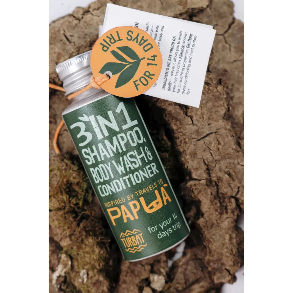 Сухий шампунь-мило-кондиціонер Turbat Papua – 3 в 1 шампунь-мило-кондиціонер створений для гір, експедицій та вільних мандрів, коли вага має значення, щоб ніжно очистити твоє тіло та волосся. Безводна формула економить вагу втричі: всього 30 грам cухого порошку на 14 днів подорожі! Усі компоненти повністю натурального походження.